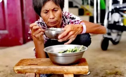 阜南有个名叫张国珍的农妇,多年重度脊柱畸形,丧失劳动能力,不能直立行走,不能平躺睡觉,不能正常吃饭。大家伙都喊她“折刀人”